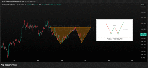 No aspecto gráfico, a recente queda do Bitcoin, somada à correção do final de agosto, pode estar desenhando um padrão clássico de fundo duplo, que geralmente antecede movimentos de alta. Caso essa estrutura se confirme, a região dos 118 mil dólares se torna o ponto-chave para validar a retomada da tendência. Uma quebra consistente dessa resistência abriria caminho para o preço buscar novamente o topo histórico, desencadeando mais uma onda de valorização para todo o mercado cripto.
