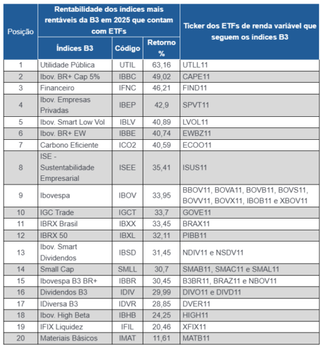 Os principais índices de renda variável da B3 registraram valorização em 2025, com destaque para os que contam com ETFs que acompanham seu desempenho, com ganhos acima de 60% no ano. Um levantamento realizado pela bolsa do Brasil revela os 20 indicadores com maior valorização entre os que têm ETFs atrelados, que facilitam o acesso a suas teses de investimento.