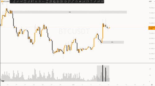 Ao analisar o fluxo, é possível observar que, no curto prazo, o volume está vendedor. Este movimento sugere que o preço poderá buscar os suportes dos US$ 69.150. Caso esse suporte seja superado, o próximo alvo está nos US$ 63.000.